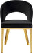Seat dinner guests in elegant style with the Roberto velvet dining chair from Meridian Furniture. This fabulous chair features a rounded back with strategically placed opening for visual beauty and to allow air flow while you dine. The rich upholstery is chic and modern, and it has a soft feel against the skin. This chair rests on iron legs for superb support, and each leg is finished in for a modish slant that meshes well with your up-to-the-minute dining room decor.