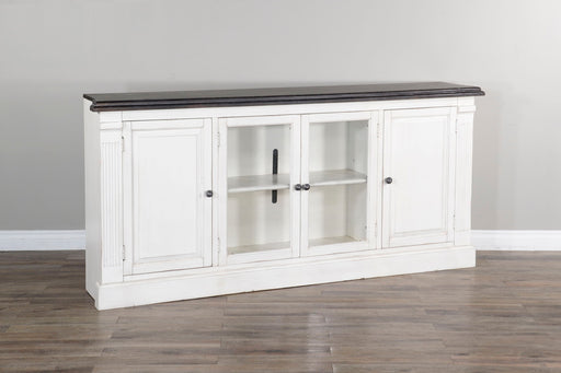 Sunny DesignsThis 70" TV console was built with rough sawn mahogany solids and veneers with glass doors and was beautifully finished. 70" TV Console - Marble Wh...