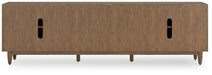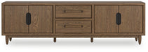 Introducing a TV stand inspired by the architectural language of mid-century expression. Its spacious cabinets and drawers provide ample storage, while a sleek design allows the natural beauty of the wood to shine through. Ready for a cinematic experience? This entertainment center is perfect for movie nights and relaxation.
