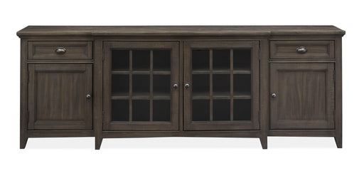 Magnussen FurnitureWestley Falls - Entertainment Console. 2 wood framed glass doors in the center. 2 adjustable Wood shelves behind the doors. 2 felt lined top side d...