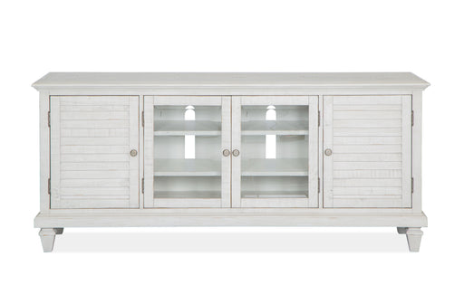 Magnussen FurnitureHeron Cove - Entertainment Console. 2 wood framed glass doors in the center. 2 adjustable Wood shelves behind the doors. 2 felt lined top side draw...