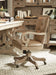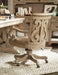 Gustavian influenced Tinley Park home office creates charming ambiance in a soft Dove tail Gray finish. Sit to the perfect work setting at one of three desk options that feature weathered pine solid tops resting atop open scrollwork bases on the writing desk, a fresh take on the executive desk with open shelf storage at the bottom and matching hutch or select the unique counter height desk, fully appointed with letter bins and small drawers on the vintage inspired hutch. Use the fully upholstered swivel desk chair the handsome counter height desk chair for comfortable work seating while an open bookcase features the open scrolled fretwork on the sides for gracious working away from work.