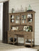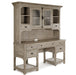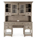 Gustavian influenced Tinley Park home office creates charming ambiance in a soft Dove tail Gray finish. Sit to the perfect work setting at one of three desk options that feature weathered pine solid tops resting atop open scrollwork bases on the writing desk, a fresh take on the executive desk with open shelf storage at the bottom and matching hutch or select the unique counter height desk, fully appointed with letter bins and small drawers on the vintage inspired hutch. Use the fully upholstered swivel desk chair the handsome counter height desk chair for comfortable work seating while an open bookcase features the open scrolled fretwork on the sides for gracious working away from work.