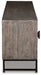 | Details | Made with wood, Distressed gray finish, Metal base with black finish, Door fronts with diamond pattern, 2 doors with soft-close hinges, 3 shelves, Openings in back for electronics, Assembly required | |
