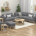 If you thought amenities were only for motion furniture, think again. The completely stylish Maeve collection offers a console with hidden storage, stainless steel cupholders, a wireless charging station, and a Bluetooth speaker with USB chargers. An extra-wide, barrel-shaped accent chair is accompanied by a matching barrel-shaped storage ottoman. The spacious wedge of the sectional makes for extra cuddling space, while the gorgeous dark gray fabric sits atop a warm-toned exposed wood base. Get the whole package with the Maeve collection.