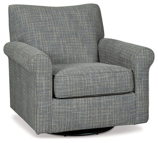 Signature Design by Ashley®Sporting a tantalizing tweed weave fabric in such a soothing blue hue, this swivel glider accent chair gives the classic roll arm chair a modern tw...
