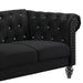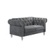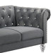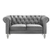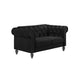 The New Classic Emma Chesterfield Velvet 2 Seat Sofa Loveseat is a blend of soft elegance and sophisticated design. Crafted from 100% polyester velvet fabric, it offers cozy and indulgent seating for two. The glam tailoring features tufted backs and arms adorned with glimmering crystal buttons, adding a touch of luxury without compromising comfort. Upscale accents, including silver nailhead trim on the rolled arms and silver turned bun feet, enhance the velvet fabric. Shipped unassembled for easy placement in any home, its lower profile height makes it small space-friendly, fitting well into smaller rooms while providing full-size seating. Enjoy supportive seating with full foam cushions that provide ample comfort. Add a little sparkle in your home with the Emma Loveseat.