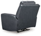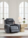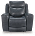 Prepare to be moved. This power recliner combines sleek modern design with all the soothing features you've been dreaming of. Wrapped in blue-hued leather and faux leather for affordable luxury, this highly contemporary piece with cozy scoop seating suits your relaxed vibe. Infinite reclining and headrest positions are yours at the touch of a button. It's the perfect choice for anyone who wants their comfort with a side of style.