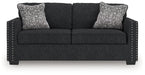 This stunning sofa leaves a lasting impression. Its cozy cushions, chic coal-colored upholstery and striking nailhead trim are a perfect blend of comfort and contemporary design. And here’s the showstopper—ambient red, white and blue LED lighting along the sofa's base. The look is simply wow.