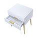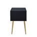 The Denvor end table brings a retro style with a classy feel. This table rectangular top featuring gold finished legs, accented by a matching gold drawer pull. This table is perfect addition to any living room, bedroom, or hall way to add a stylish storage option. Some Assembly Required.