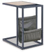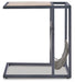 Casual contemporary design with a clean silhouette. That's the beauty of this chairside end table. Quality crafted with elm veneer, its tabletop is finished in a light natural wood tone that lends a fresh, organic look. Cool metal C-frame in a matte black finish and a hanging magazine basket made with a durable brown faux leather coordinate beautifully with the less-is-more profile.