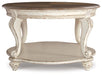 Elevating the art of traditional cottage styling, this oval coffee table is sure to serve you beautifully for years to come. Antiqued two-tone aesthetic blends a chipped white with a distressed wood finished top for added charm. Classic cabriole legs and shapely lower shelf are a lovely twist. Decorative corbels add refinement.