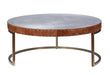 Enhance the modern vibe of your living room with the Tamas round coffee table. Its slender metal base is artfully curved to add style, and the aluminum patchwork table top provides a durable surface for piping hot or ice-cold beverages. The apron is wrapped in smooth top grain leather in a beautifual cocoa color for the perfect accent.