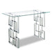 Enjoy a contemporary look in your living room or den with this stylishly elegant Alexis chrome table. This Meridian Furniture table is made from glass and metal for a sleek, modish look. The base features a geometric design with intertwined squares that form two pedestals. The top is crafted from thick, clear glass that allows the beauty of the base to shine through completely. A chromed finish shores up the design, adding to its up-to-the-minute feel.