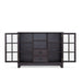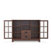 Extremely functional, the Dubbs cabinet features both open storage and drawer and framed glass door storage. Featuring 2 lower drawers and flanking doors that open to useful adjustable 2 shelves, this console table will help you entertain and keep items stored. The finish and arts and crafts hardware are helpful in blending into any decor.