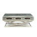 Assembled, Rectangular Coffee Table: Trunk Top Design • Storage: 3 Drw (Open Base) •• CONSTRUCTION •• Trunk Top & Drawer: Aluminum with Ply Frame • Metal "X" Shape Base & Crossbar Support: Iron Base • Drawer: GLIDE Side Metal (Full Ext.), FABRIC Lined (Fully Covered), SELF CLOSE (Auto-Soft Closing), Hardware: Top Grain Leather Single Handle, Drawer Size: 13" x 15" x 3"H