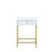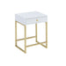 Bring the trending contemporary style into your home with this updated Coleen side table. This side table comes with a drawer providing you an additional space to storage. With featuring white top and brass base, this accent piece will be an elegant piece for any decor. Measures 16" x 12" x 22"H. Drawer with side metal glide.
