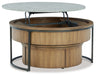 | Details | Set includes lift-top coffee table and rolling storage trunk, Made with oak veneer and engineered wood, Light, natural finish, Metal frame with black finish, Coffee table with faux cement melamine top; lift-top mechanism, MEGA-TUFF® melamine surfaces are made of easy-clean melamine which is heat-, scratch-, water- and stain-resistant, Nesting design storage trunk with casters for easy mobility, Assembly required | |