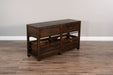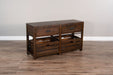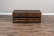 This Homestead table features a distressed, tobacco leaf finish that adds a hint of beauty and style to your living space. Made from mahogany solids and veneers, this table is strong and durable for long-lasting usage. The lower storage crates have full extension drawer guides and are removable. It also features nut head metal pipe accents and decorative hardware.