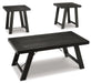 | Details | Includes coffee table and 2 end tables, Made of Acacia veneers, wood and engineered wood, Distressed black wash finish, Canted legs with stretchers, Tops have a bread board layup with a planked effect, Coffee table with tension bars, Assembly required | |