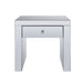 The Noralie End Table will give any room a touch of glamour. This contemporary end table is fully mirrored with a stunning mirror top and a faux diamonds inlay on each leg of its sled base. Use this unique piece as the perfect accent for any room Decor. One storage drawer provides ample and convenient storage for makeup brushes, jewelry, and more.