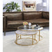 Entertain in style with the Shanish Coffee Table Set. This distinctive two-piece occasional table set showcases intertwining tables with a gold finished metal base that nestles together or can separate for additional entertainment and display space. This unique round coffee table set features one large table with glass top and a smaller table with faux marble top and is a must-have accent piece for your home. Use it to add a touch of contemporary flair to a traditional space or to simply complete a modern aesthetic.