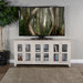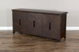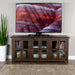 This 70" TV console was built with rough sawn mahogany solids and veneers with glass doors and was beautifully finished.