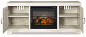 | Details | Includes TV stand and electric fireplace insert (W100-101), Made with engineered wood (MDF/particleboard), Antiqued white finish over replicated oak grain, 2 storage cabinets (each with an adjustable shelf), Removable/adjustable center shelf, Cutouts for wire management and ventilation, Electric fireplace insert provides up to 5,386 BTU/1,500W and warms up to 1,000 square feet (heats larger rooms), 7-level temperature setting; 5 levels of flame brightness, LED-lit multi flame display operates with or without infrared heat; realistic-looking log set with dynamic glowing embers, Remote control with LED display, Timer function with programmable ranges from 10 minutes to 9 hours; overheating control device, Power cord included; UL Listed, Assembly required; simply remove the center shelf and back panel to make room for the fireplace insert | |