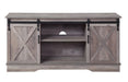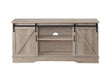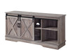 Enjoy a warm and cozy family TV time with this cottage-style TV satnd. The rustic casegood has two sliding barn doors with classic Z overlay and pull handles. Metal sliding hardware is coated with finish, providing smooth operatin and chic look. Two media compartments with back holes for cable managemen help you organize all your television equipment, while four covered storage spaces behind doors preserve your CD collection or personal items.