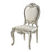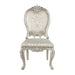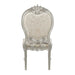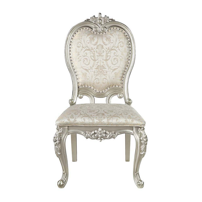Add traditional glamour to your dining space with the Devayne side chairs. They are as comfortable as they are beautiful with their foam padded seats and backrest. Upholstered in sumptuous jacquard fabric for an added stylish touch. Floral moldings are present on the top of the backrests and on the legs and apron, nailhead trim is the perfect finish touch to these chairs.