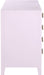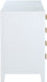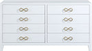 Bring unique elegance to your bedroom with this Bowtie dresser from Meridian Furniture. This dresser features eight drawers, providing you with plenty of storage space for clothes, linens, or miscellaneous objects. Its light color adds a touch of femininity to your living space, and its brushed bow tie handles complement your existing decor. Its flat top is perfect for placing a lamp, framed picture, books, bric-a-brac, and more.