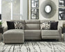 Delightfully modern. Exceptionally comfortable. When it comes to modular furniture with easy-elegant appeal, it’s hard to beat this power reclining sectional. Wrapped in a decadently plush stone-tone fabric for neutral versatility, this chic sectional is dressed to impress with a clean-lined divided back, curved track arms and a low-profile back for a relaxed, contemporary aesthetic.