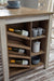 Details D394-32: Made of solid wood, engineered wood and acacia veneers, Two-tone finish, 2 shelves, 8-bottle wine rack, Seats up to 4, Assembly required, D394-024: Made of wood, Distressed grayish white finish, Polyester upholstery over foam cushion, Assembly required,