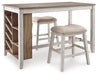 Raise the bar on small space living with the Skempton 3-piece counter-height dining set. An inspired choice for coastal chic or modern farmhouse settings, this strikingly simple table marries a brown tone plank-effect top with a rubbed-through grayish white base for timeworn appeal. The table’s side shelves and 8-bottle wine rack cleverly balance form and function while the comfortably cushioned bar stools serve up high style.