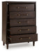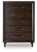 Details Made with hardwood solids, mango wood veneer and MDF substrates, Merlot finish, Solid wood pulls with brass-tone metal accents, 5 smooth-gliding drawers with fully finished interiors, French/English dovetail construction and heavy-duty ball-bearing side glides, Top drawer felt lined, Round tapered legs