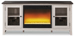 | Details | Includes TV and electric fireplace insert (W100-02), Made of decorative laminate and engineered wood, Two-tone finish (replicated gray wood top and antique white base), Pair of glass inset doors, Adjustable center shelf; 2 side shelves and cutouts for wire management, Electric fireplace insert provides up to 4,608 BTU/1,400W and warms up to 400 square feet (heats a mid-size room) , 6-level temperature setting; 5 levels of flame brightness, LED-lit flame operates with or without heat, Option for placing faux glass crystals or stones (included), Overheating control device, Remote control with LED display, Power cord included; UL Listed, Assembly required; simply remove the center shelf and back panel to make room for the fireplace insert | |