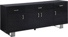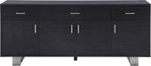 Organize flatware and silverware in the three spacious drawers of this Excel sideboard buffet. This beefy sideboard offers room aplenty for holding things you need in the dining roomout of sight and out of mind. The rich gray oak veneer lacquer finish with chrome base and handles gives this unit the modern panache needed to mesh with nearly any contemporary dining set. Wood and stainless steel construction ensures lasting beauty and long-lived performance.