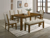 Transform your dining space into a haven of warmth and style with this stunning ensemble, perfect for both casual and formal settings. The tailored chairs and tufted bench are upholstered in a soft neutral fabric, providing luxurious comfort and a modern touch. The table's alternating wood tones and textures create depth and visual interest, offering a timeless aesthetic with a handcrafted feel. The detailed arrangement emphasizes the beauty of the natural material while adding a sophisticated and dynamic touch to any surface, making it perfect for a statement piece or a versatile complement to a variety of styles. Designed to enhance both functionality and aesthetics, this set creates an inviting atmosphere for family meals, celebrations, or quiet evenings at home.