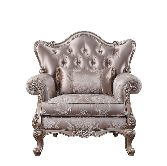 KD Leg, Tight Back & Loose Seat Cushion (1+1) 2 Pillows Included, Buttonless Tufted, Scrolled Floral Molding Trim CONSTRUCTION: [sc]; Inside Frame: Wood (), Foam (CA) CUSHION: Box Cushion w/Welt (R) BACKREST: Wingback Style (Button Tufted) ARMREST: Rolled (Front Scrolled Trim) Padded BASE w/Scrolled Trim Material: Fabric (Solid Pattern; Inside Armrest/Seat Cushion/Base w/Floral Pattern) Pillows: Square Shapes (Same Body Finish/Solid+Floral), (R)