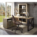 Switch up your style in the study with the clean-lined Jennavieve desk, a perfect addition for achieving a contemporary look. Whether you're working from home or simply scrawling a quick to do list, having a spirited space to get things done always makes them more fun. This beautiful desk features a stunning patchwork gold aluminum top and sturdy iron legs with a unique X-shape. Matching case pieces for this modern masterpiece include a storage cabinet with one shelf and two drawers. Offering a blank canvas for all your desktop ideas, this piece is perfect for any room Decor.