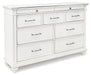 Give your retreat vintage charm and valuable drawer storage with this dresser. In a beautifully distressed whitewash finish, you'll love putting it all away in casual style. Seven full-sized drawers and two accessory top drawers will easily accommodate your needs. Generously scaled moulding from top to bottom, along with bun feet and drawer handles with a transitional aesthetic, give this dresser character—evoking the feel of a quaint cottage escape.