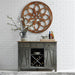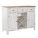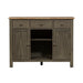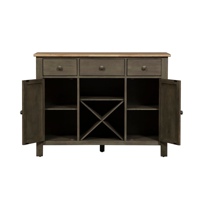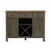 Invite a classic look with a casual feel into your home with the Lindsey Farm server. Crafted of rubberwood solids and veneers with MDF, this piece features inverted v design on both doors, levelers to protect your flooring and adjust the height, three drawers accented with gray wood knob hardware, one adjustable shelf behind each door, and removeable x shaped wine shelving. This piece has an alternate finish and offers a look that compliments today's homes with style uncompromised.