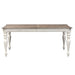 Create a grand gathering with the Magnolia Manor optional table set, consisting of splat back side chairs and a rectangular table. Crafted of poplar solids with cathedral white oak veneer, this kit features an antique white finish with heavy chipping and a weathered brown top with whitewash. The table offers a fancy face top, canted corners, two 18" leaves to easily accommodate guests or a large family and is anchored by faceted turned legs. The chairs feature the perfect blend of European design with a saddle shaped seat, dog bone accents on the splat back, nylon chair glides to protect your flooring, and beautifully faceted turned legs. Warm antique finishes and artistic distressing along with grand scale create a piece to be passed to generations.