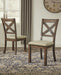 This upholstered dining chair elevates the art of casual rustic style. With a distressed nutmeg finish, antiqued nailhead trim and textured polyester fabric, this upholstered dining chair with classic X back styling entices with warmth and earthy elegance. Cushioned seat accommodates lingering meals enjoyed in comfort.
