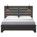• The Thompson queen bed with lights appeals with the classic beauty of straight lines and the natural charm of its rustic details. Replicating the look of wood grain, the dark gray laminate wraps around the entirety of each piece for a seamless and uniform finish. Two industrial-inspired reading lights are integrated into the planked headboard to illuminate your favorite book or create a cozy ambiance. Thoughtful details on the case pieces include decorative corbels arcing up at the base, dark-toned bar hardware, and fully finished drawer interiors with an attractive linen print.