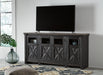 Shabby chic with a hint of down-home country, this TV stand appeals to today’s more relaxed sensibilities. Its richly rustic two-tone effect blends a textured black finish with a weathered gray-brown top for an easy-elegant aesthetic. Framed doors with crossbuck detailing and clear glass insets bring a touch of modern farmhouse to the scene.