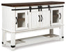 To those with an appetite for rustic farmhouse living, this server dishes out irresistible form and function. A pair of cabinet doors with mesh wire inlays add a countrified cool element. Sliding “barn doors” revealing even more shelved storage are right on trend. This server’s two-tone aesthetic pairs a distressed vintage white with an aged natural pine color top for twice the charm.