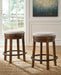 | Details | Made of wood, Round metal footrest with black finish, Rustic brown finish, Cushioned seat with beige woven fabric upholstery, 360-degree swivel, Nailhead trim detail, Assembly required | |