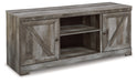 This TV stand with fireplace option is sure to win your heart with its daring designer take on modern rustic. The stand’s crisp, clean and minimalist-chic profile is enriched with a striking replicated oak grain with thick plank styling and a weathered gray finish for that much more authentic character. Crossbuck detailing adds a brilliant barn door inspired touch. Compatible with W100-101 and W100-02 electric fireplace inserts, sold separately.